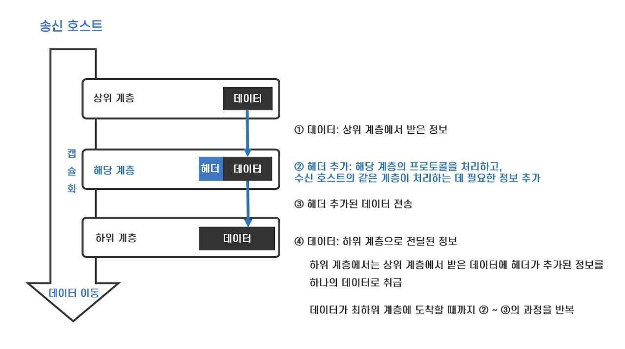 캡슐화란 송신 호스트에서 해당 계층의 프로토콜을 처리하고 데이터에 헤더를 붙이는 작업을 말합니다. 헤더는 수신 호스트의 해당 계층에서 데이터를 처리할 때 필요한 정보를 담은 것입니다.
