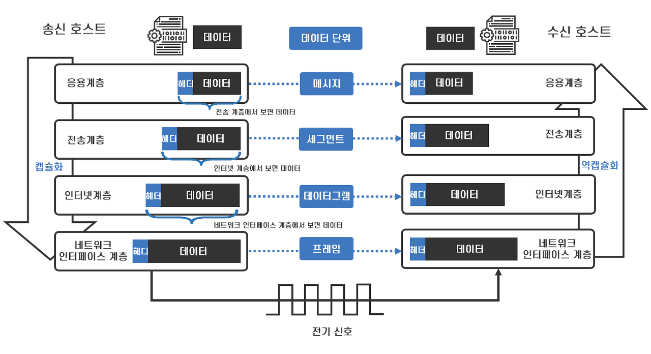 송신 호스트의 상위 계층 즉, 응용 계층(Application Layer) > 전송 계층(Transport Layer) > 인터넷 계층(Internet Layer) > 네트워크 인터페이스 계층(Physical Layer) 순서로 캡슐화가 진행됩니다. 그리고 최하위계층에서 전기신호로 변환되어 전송 매체를 통해 라우터 등의 중간 노드를 거쳐 수신 호스트의 최하위 계층에 도달하게 됩니다.